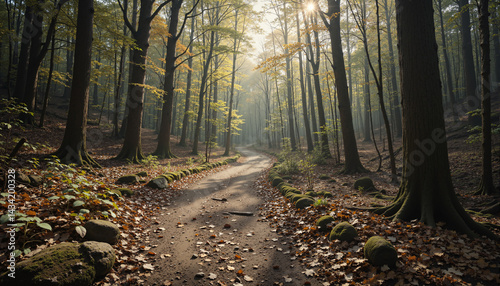 © Ventura, Fototapeta premium The image shows a path winding through a forest of trees with the sun shining through them. The ground is covered with dried leaves and rocks