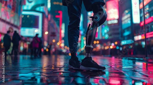 © Jiraphiphat, Fototapeta premium The image shows a person with a prosthetic leg walking down a city street at night