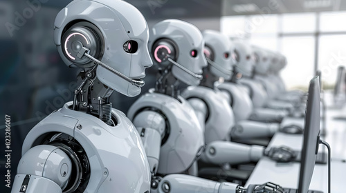 Fototapeta premium The image shows a row of humanoid robots sitting at a desk and looking at something. The robots are all wearing headsets and have their hands on the desk.