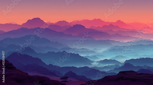 © Ryulookyee, Fototapeta premium the image shows a serene mountain landscape in the evening. several layers of mountains fade into the distance, creating a sense of depth