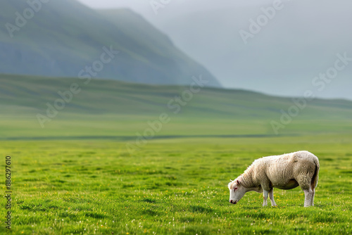 © Oranuch, Fototapeta premium The image shows a sheep grazing in a lush green field with a mountain in the background.