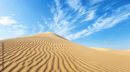 Naklejka premium The image shows a vast expanse of sand dunes under a clear blue sky. The...