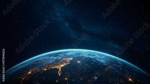 © Archara, Obraz premium The image shows a view of Earth from space at night, with city lights illuminating the landmasses and a starry backdrop showing the Milky Way.A medium description sentence: From space, Earth's glowi