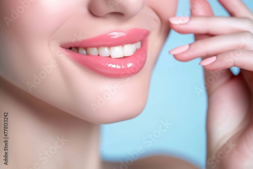 Obraz premium The image shows the female part of the face with beautiful lips, a gentle touch of hands, emphasizing perfect, smooth skin, radiating beauty and well-groomed