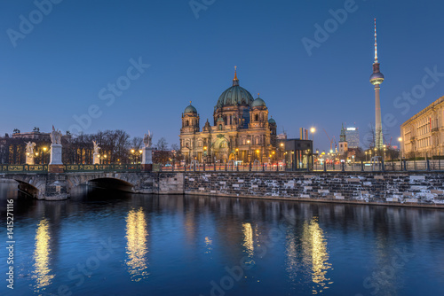 Obraz premium The imposing cathedral and the famous TV Tower of Berlin at dusk