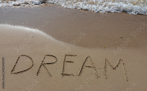© Oleh Marchak, Fototapeta premium the inscription DREAM on the sand of the coastline