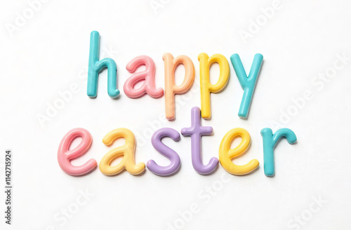 © Julia, Naklejka premium The inscription Happy Easter on a light background, painted eggs.