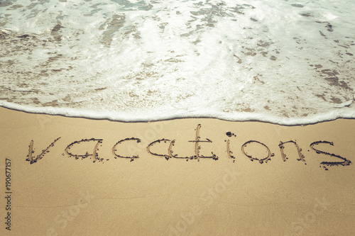Fototapeta premium The inscription on the sand. Inscription on the bank of the ocean"vacation".