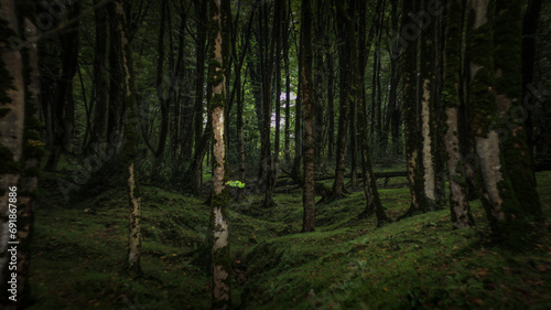 Fototapeta premium the inside of a forest with lots of green moss and trees