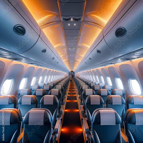© KayKai, Fototapeta premium The inside of an airplane with many seats and a bright orange light