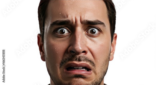 © syukri, Fototapeta premium The intense and dramatic facial expression of a man filled with fear, shock, and disgust, isolated on a white studio background