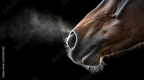 © Anastasiia Havelia, Obraz premium The Intensity of the Race - A close-up of a horse’s mouth, its breath visible in the cool air, sweat glistening on its coat.