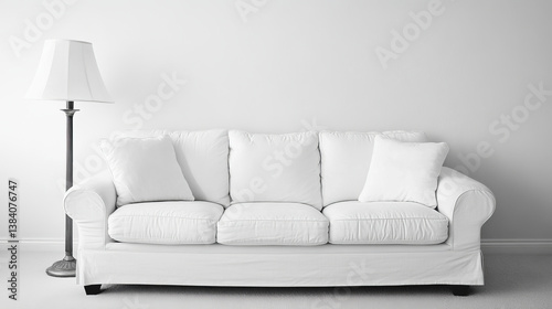 © Qaqas, Obraz premium The interior has a White sofa and lamp on empty white wall background,3D rendering