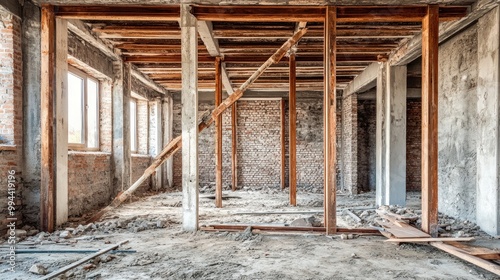 © angel_nt, Obraz premium The interior of a building under renovation features exposed brick walls and wooden beams, creating a raw and industrial atmosphere while sunlight streams through the window openings