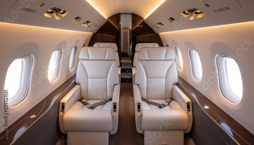 © Wonderful Studio, Fototapeta premium The interior of a plane is filled with white seats and a wooden paneling