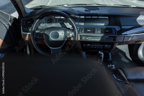 Obraz premium The interior of a premium car features a leather interior with a dashboard and a multi-function steering wheel. Taxi driver. Auto