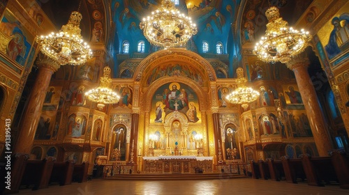 © sarun, Obraz premium The interior of an Orthodox church featuring ornate iconostasis, chandeliers, and detailed frescoes.