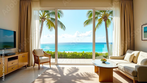 © Ольга Симонова, Obraz premium The interior of the hotel room with a view of the ocean for a beach holiday and travel.