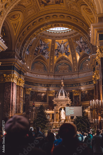 © Katerina Tretiakova, Obraz premium The interior of the main Basilica of Hungary, a large Christmas tree inside the church and many people came to pray at the Christmas. Many gold decorations and icons.
