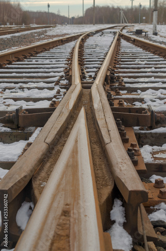 Obraz premium The intersection of railway tracks in the form of arrows.