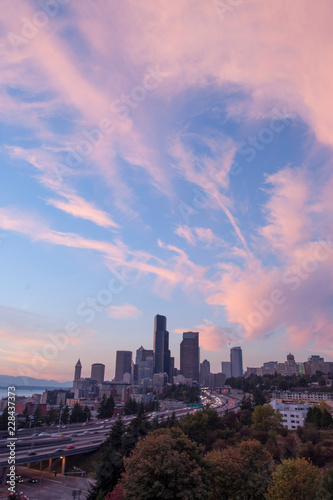 © Dene' Miles, Fototapeta premium The interstate leading up to Seattle at sunset - Washington state