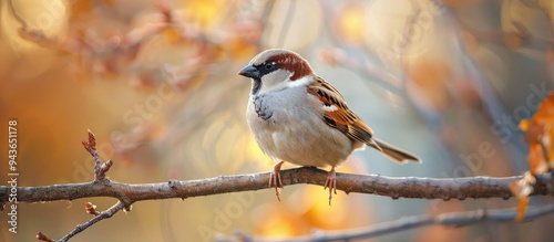 © vxnaghiyev, Fototapeta premium The intimidating sparrow gazes into the camera lens A sparrow is perched on a tree branch. with copy space image. Place for adding text or design