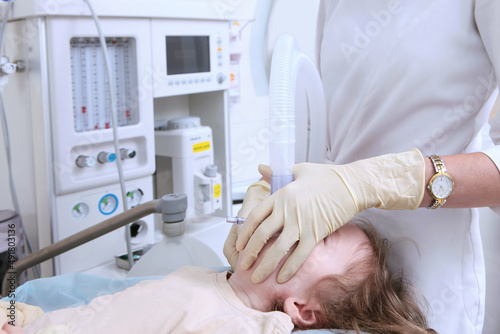 © Alla, Obraz premium The introduction of the child into anesthesia before surgery. Oxygen mask on the child's face. The work of a resuscitator.Surgery under general anesthesia. A device for artificial lung ventilation.