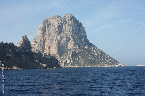Naklejka premium the islet of Es Vedra among the mist on the blue water of the ibiza sea