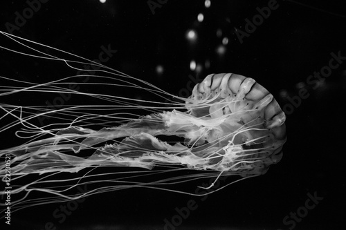© usssajaeree, Obraz premium The jellyfish on black background.
