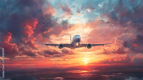 Fototapeta premium The jet plane races across a watercolor sunset, the soft, flowing colors of the sky contrasting with the sleek, metallic sheen of the aircraft