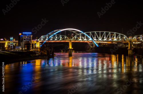 © khalid, Fototapeta premium The John Seigenthaler Pedestrian Bridge at night as seen from Cumberland Park looking back at the Nashville downtown and the Korean Veterans Blvd Bridge