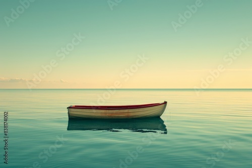 Naklejka premium The joy of a successful catch, Solitary red and white boat on calm sea, minimalist composition, pastel sky, serene water reflecting sky, sense of peace, morning stillness.