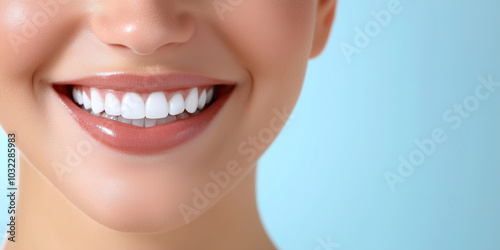 © Maksym, Obraz premium The joyful, bright smile of a woman showing her perfect white teeth, with a softly blurred blue gradient in the background, evoking feelings of confidence and beauty.