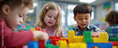 © Albi, Fototapeta premium The joyful children building with colorful blocks in a classroom setting.