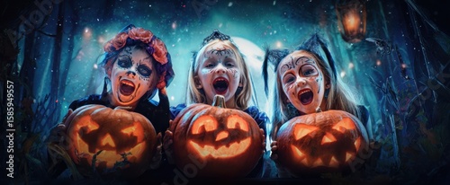 Naklejka premium The joyful children celebrating Halloween with carved pumpkins in spooky...