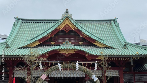 Obraz premium The June Shinto religious ritual at the shrine of Japan, going through the ring of Kaya, for purification and Harae, “Natsukoshi Oharae Ceremony”, year 2022 June 14th