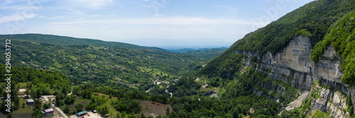 Fototapeta premium The Kinchkha waterfall in the canyon of the river Okatse. Rest in Georgia. High waterfall in the Imereti region. Rocky ledges of the mountain with green trees