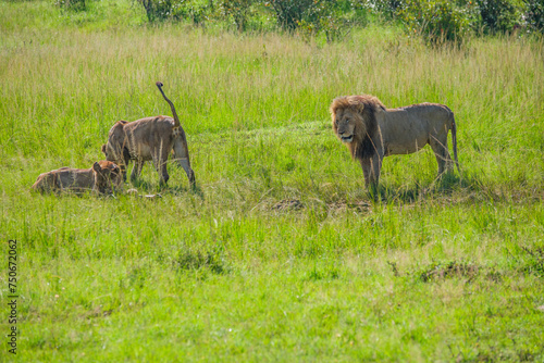 Naklejka premium The king of the Masai mara feeds on a family of great lions