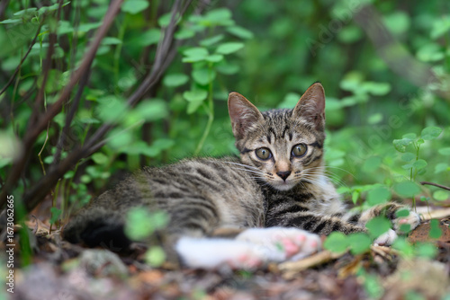 © chendongshan, Fototapeta premium The kitten hid among the plants.