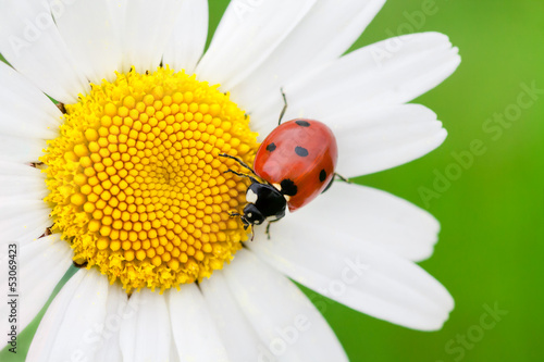 Obraz premium The ladybird creeps on a camomile flower