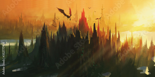 © liuzishan, Fototapeta premium The lair of the dragon by the river valley, digital painting.