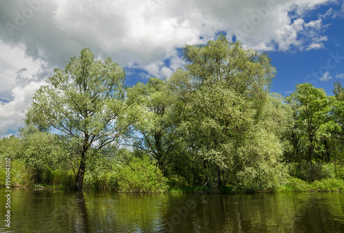 © Андрей Медведев, Fototapeta premium The lake is surrounded by trees along the banks