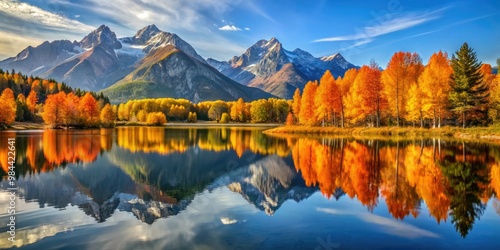 Obraz premium The lake's glassy surface mirrors the vibrant autumn hues and majestic...