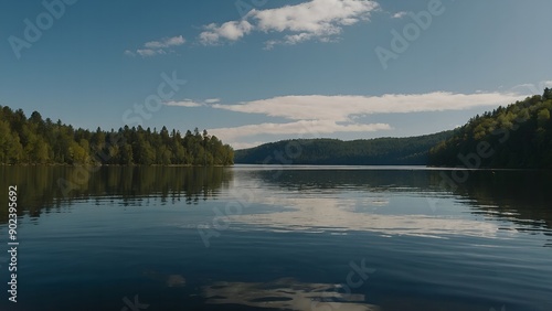 © Oleksandr, Fototapeta premium The lake’s serene waters showcasing the warm tones of a summer twilight