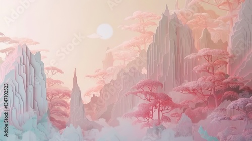Fototapeta premium The land is covered in misty, pastel-colored forests with floating paper-cut...