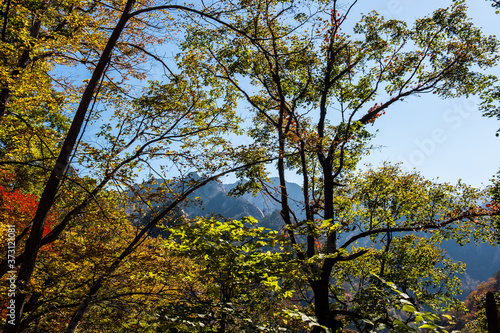 © Chongbum Thomas Park, Obraz premium The landscape of autumn mountain background blue sky.