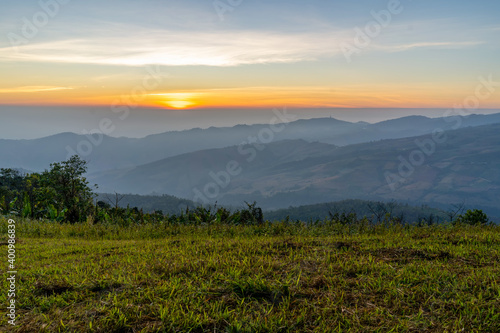 © chongsiri, Fototapeta premium The landscape of sunrise over mountains