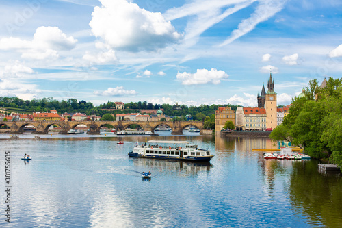 Naklejka premium The landscape of the city of Prague view from the Vltava river on the ancient...