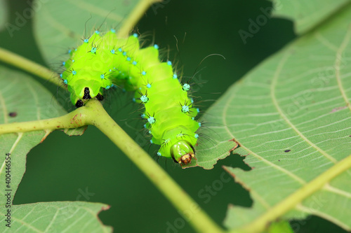 Naklejka premium The larvae of the green tailed silkworm moth are on the green leaves