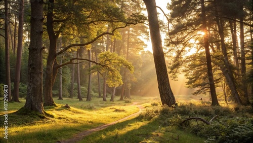© Kingphet, Naklejka premium The last rays of sunlight filter through the trees as a serene forest glade is bathed in a warm golden light, gentle light, panoramic sunset sky, serene atmosphere, warm tones, time of day